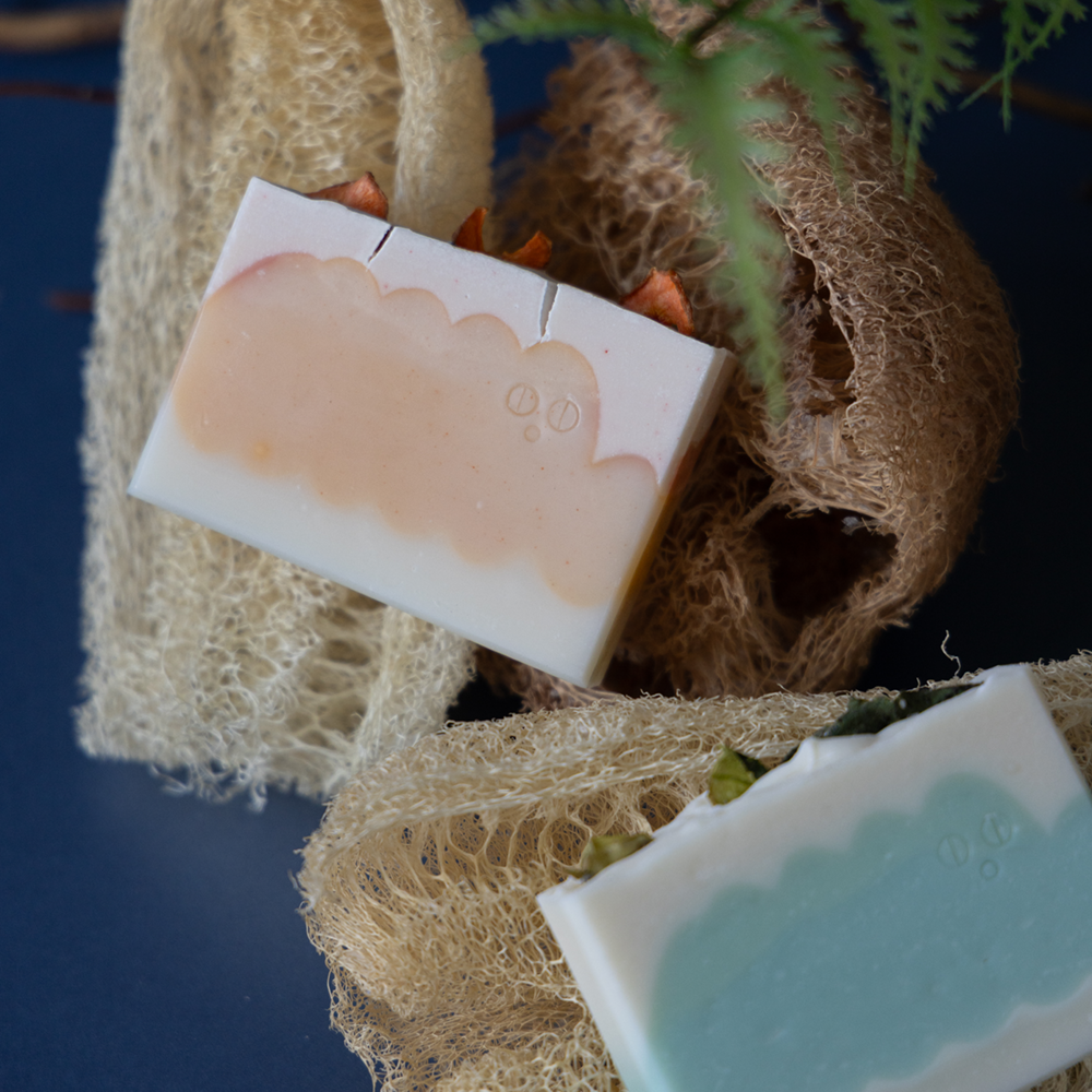 都是由乾淨餘料蔬果皮(絲瓜、紅蘿蔔、果皮等)再生而成的天然手工皂。